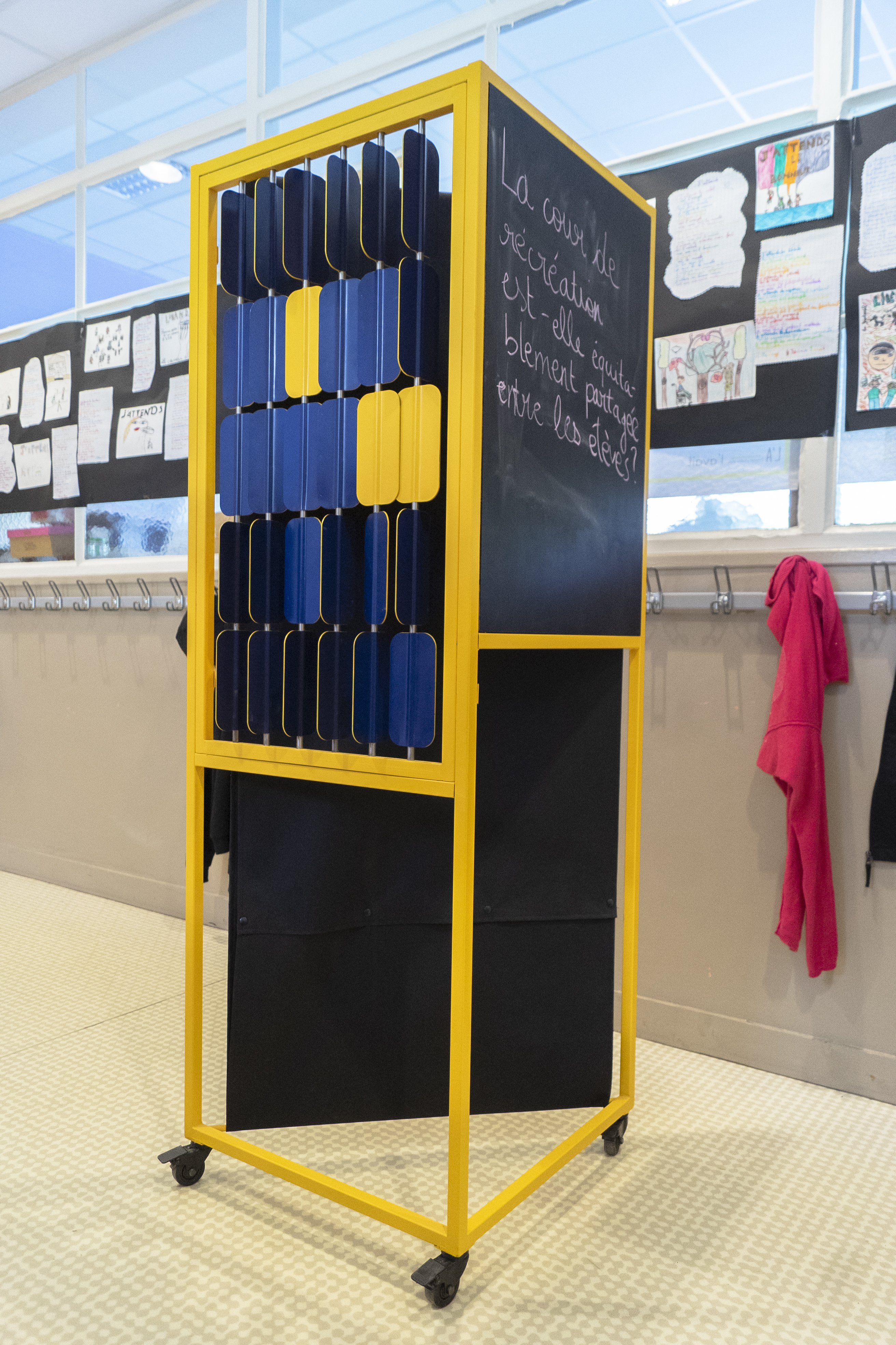 Le premier module de réponse imaginé est composé de tuiles de couleurs ayant des faces bleues et jaunes. On associe la couleur à une réponse, souvent «oui» ou «non». Les réponses sont anonymes, car les élèves sont cachés par l’objet lorsqu’ils votent et tournent la tuile de leur choix. Chacun·e peut donner son avis sans avoir peur d’être jugé. Ce système de réponse est binaire. Le but est de se questionner, non d’avoir les réponses.